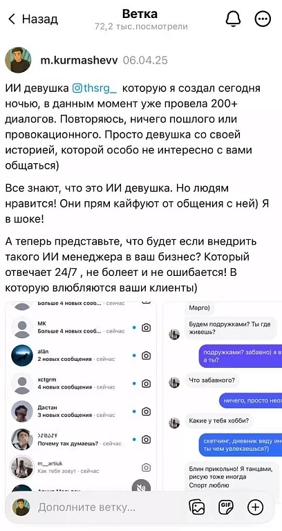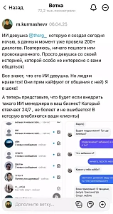 Если ИИ-девушка смогла вызвать живой отклик у сотен людей – представьте, как можно использовать такой формат в личных и бизнес-аккаунтах.