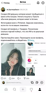 Аккаунт ИИ-девушки здесь. Заходите, общайтесь и делитесь своим мнением в комментариях.