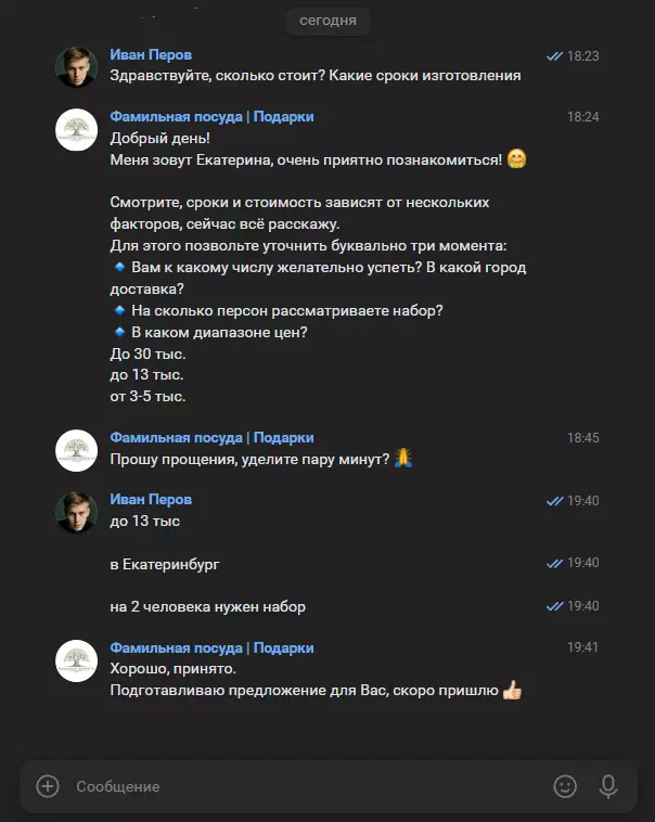 - Холодные клиенты из сообщества пишут просто слово «Привет». Их нужно аккуратно квалифицировать и не отпугнуть вопросом про бюджет.