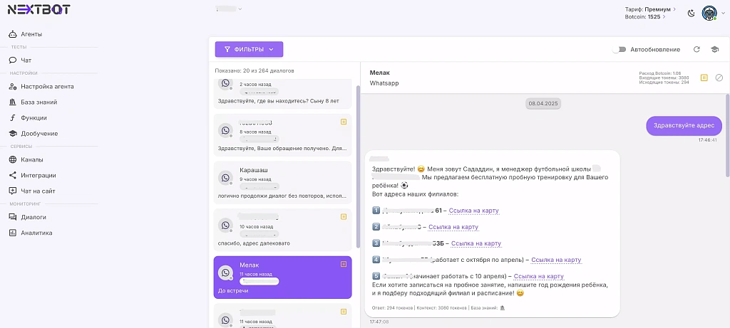 Подключили NextBot к WhatsApp, куда пишут клиенты. Интегрировались с amoCRM, чтобы заявки автоматически уходили в базу.