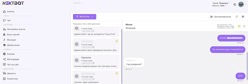 - NextBot мгновенно отвечает клиентам, узнает возраст ребенка и подбирает подходящий филиал. Если клиент действующий, узнает суть вопроса и передает информацию менеджеру.