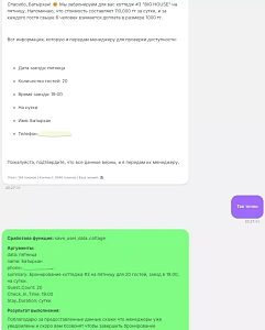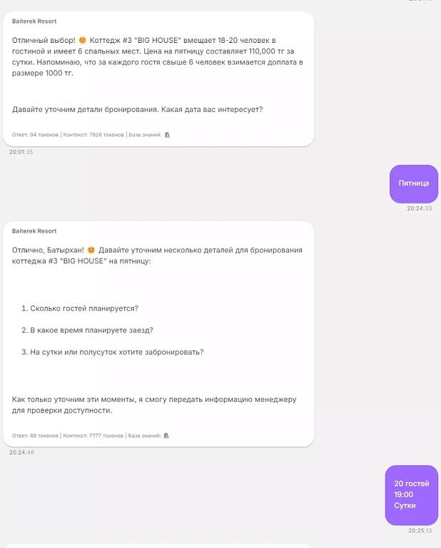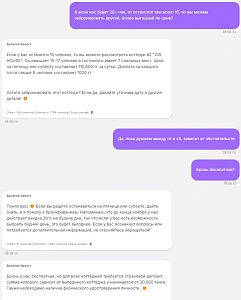 Администраторы работают только с горячими лидами – звонят клиентам для уточнения деталей и завершения бронирования. ИИ-бот пока не может самостоятельно проверять доступность номеров или коттеджей, поэтому эта задача остается за сотрудниками.