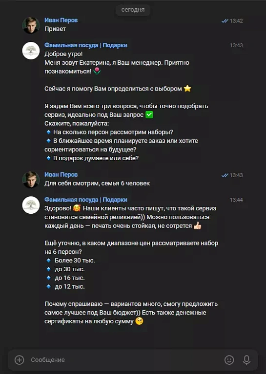 - Холодные клиенты из сообщества пишут просто слово «Привет». Их нужно аккуратно квалифицировать и не отпугнуть вопросом про бюджет.
