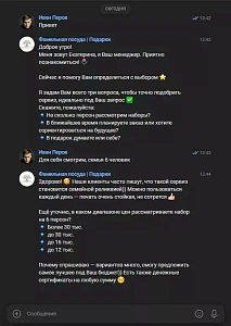 У клиента был запрос сделать бота, максимально похожего по общению на человека. Покупатель не должен понять, что ему отвечает робот. Поэтому промпты составлены так, чтобы ответы были максимально неотличимы от живого человека. Когда ИИ заканчивает работу, менеджер подхватывает диалог незаметно для клиента.
