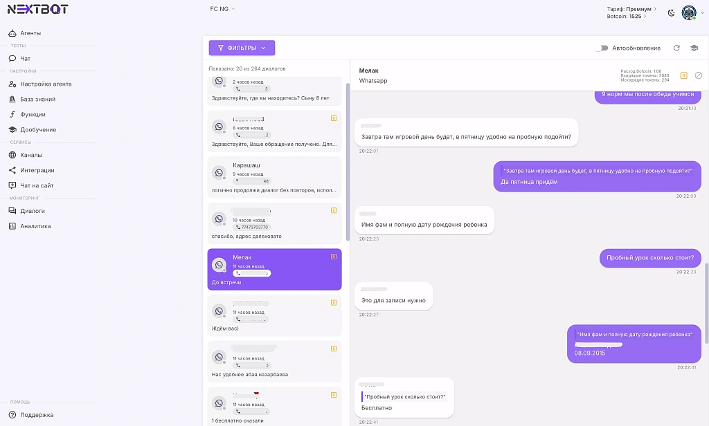 - NextBot мгновенно отвечает клиентам, узнает возраст ребенка и подбирает подходящий филиал. Если клиент действующий, узнает суть вопроса и передает информацию менеджеру.