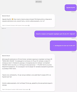 Администраторы работают только с горячими лидами – звонят клиентам для уточнения деталей и завершения бронирования. ИИ-бот пока не может самостоятельно проверять доступность номеров или коттеджей, поэтому эта задача остается за сотрудниками.